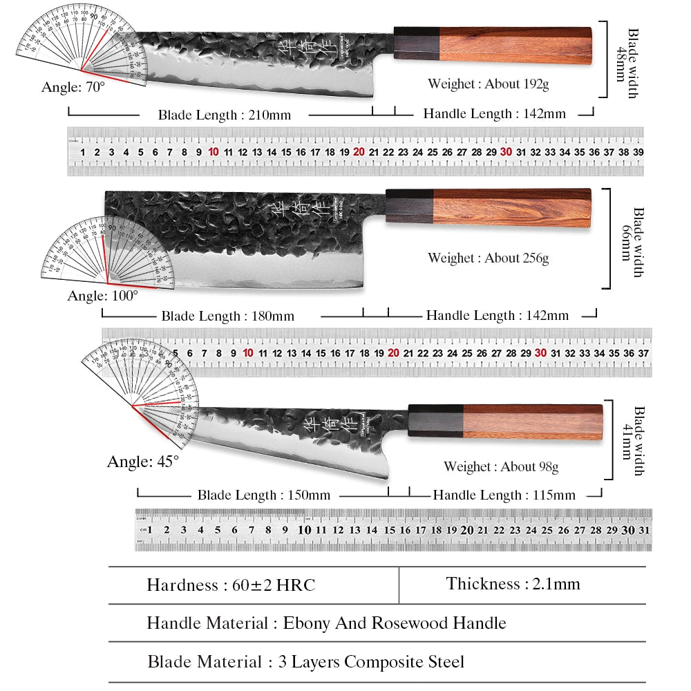 Boasting a blade material of three-layer composite steel, each knife features a core hardness of 60±2 HRC, ensuring razor-sharp edges that maintain their cutting prowess. The stunning handles, composed of ebony and rosewood, are designed not only for aesthetic appeal but also for comfort and balance, allowing for effortless maneuvering during food preparation.