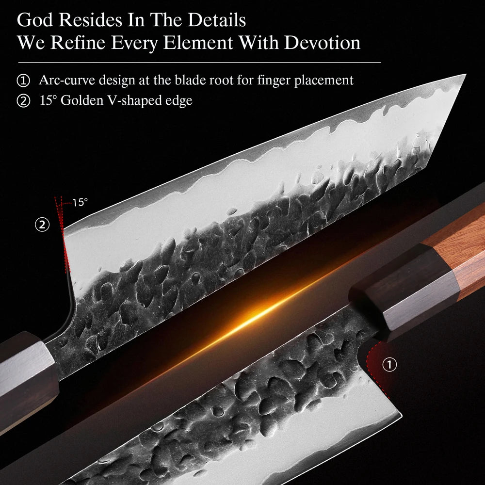 - 8.2-inch Kiritsuke Knife: The versatile workhorse, perfect for slicing through meats and finely dicing vegetables.