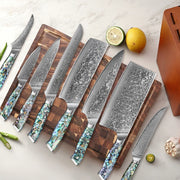 Elevate your culinary experience with the exquisite Japanese Damascus Steel Chef Knife Set, an essential collection for every culinary enthusiast who appreciates the art of cooking. This luxurious eight-piece set not only showcases formidable beauty but also embodies the pinnacle of craftsmanship. Each knife features a stunning abalone shell handle that adds an elegant touch to your kitchen, while the renowned Damascus steel blades ensure unparalleled sharpness and durability.