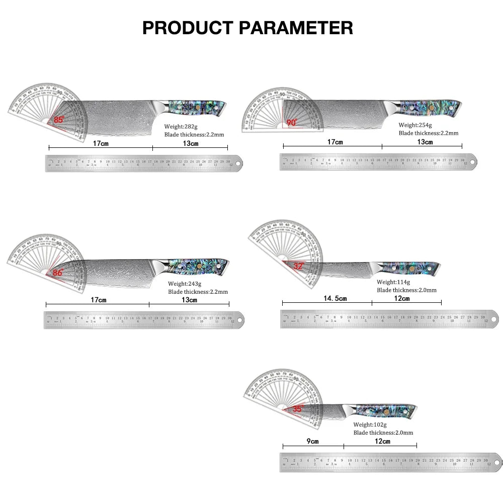 Elevate your culinary adventures with the exquisite Japanese Damascus Steel Kitchen Knife Set featuring stunning abalone shell handles. This five-piece set is not just a collection of knives; it’s an essential companion for those who appreciate the artistry of fine cooking.