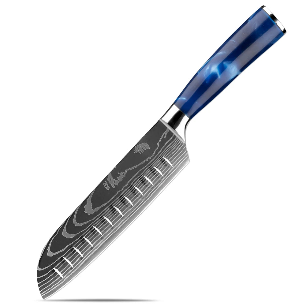 XITUO Japanese Knife Set - 6-Piece Stainless Steel with Laser Pattern Blades and Blue Resin Handles - 6PCS Full Set